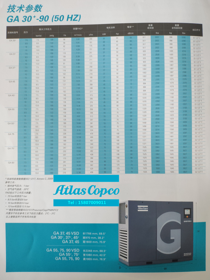 阿特拉斯空壓機(jī)GA37、GA45、GA55、GA75、GA90技術(shù)參數(shù)對(duì)照表
